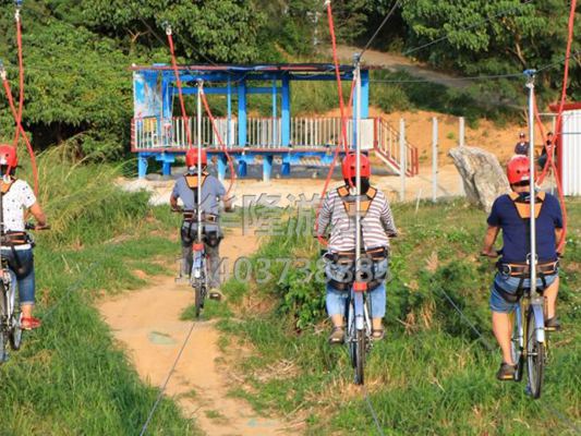 空中自行车是一项具有一定惊险刺激的游乐项目,主要借助索道上的人骑单车的速度拉动你滑行,可以跨越草地、湖泊、河流、峡谷,张开双臂耳边呼吸的风声笼罩全身,体会着刹那间的自由,充分享受其中的刺激和无穷的乐趣。